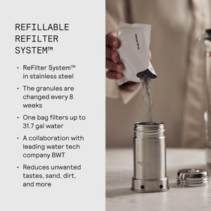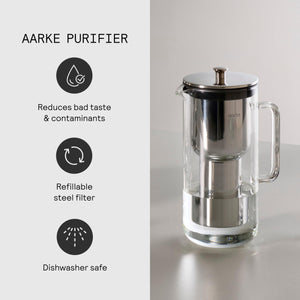 Make tap water taste clean and look good on your counter. The Aarke Purifier pairs a timeless glass carafe with a patented, refillable stainless steel filter cartridge, so you can skip disposable plastic filter cartridges and cut down on waste without giving up performance.