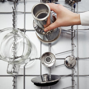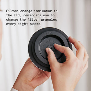 What’s in the box: Glass carafe, stainless steel lid and refillable filter cartridge (granules sold as refills).