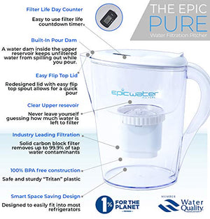 Details: nstantly transform ordinary tap water into clean, extraordinary water!! When it comes to healthy water, you and your family deserve the cleanest water available. With the Epic Pure Water Filter Pitcher you can drink with confidence knowing that the Epic Pure Pitcher has been rigorously tested by multiple independent labs for the removal of over 200+ known water contaminants including fluoride, heavy metals like lead & mercury, pesticides, herbicides, trace pharmaceuticals, and volatile organic compounds which our competitors don't touch.